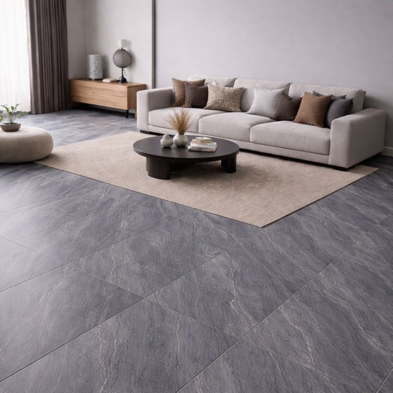 The dark grey tone delivers a neutral and contemporary visual effect that fits a wide range of interior styles. The matte surface reduces glare and creates a calm, balanced atmosphere. This combination works well in residential and commercial flooring projects.