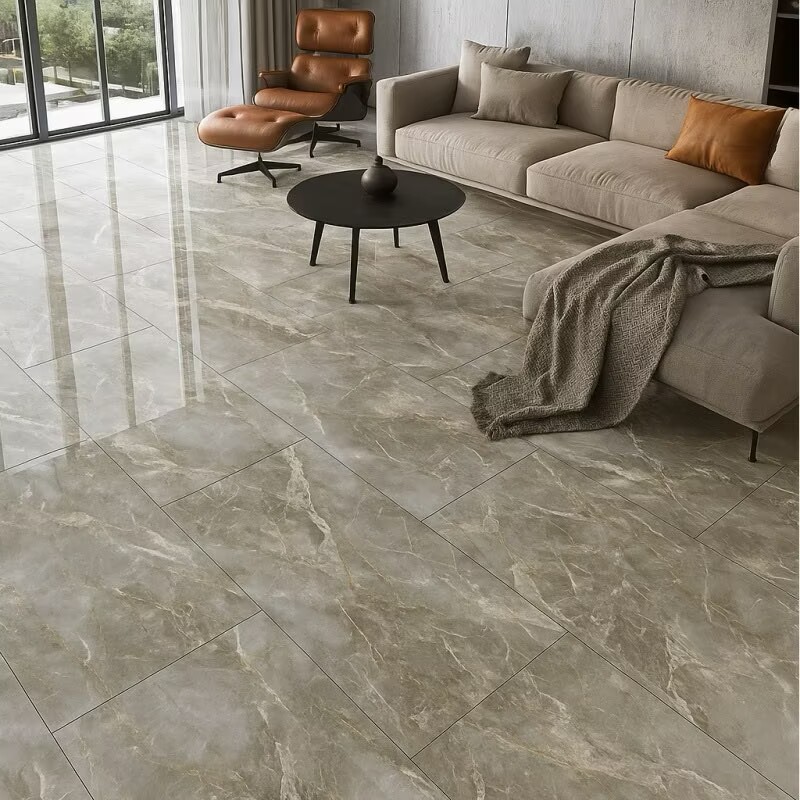 These polished porcelain tiles showcase a modern marble-inspired look, adding elegance and sophistication to any space. The large 600*1200mm format enhances visual continuity, making rooms appear more open and luxurious. Durable, easy to clean, and versatile, they are ideal for both residential and commercial interiors.
