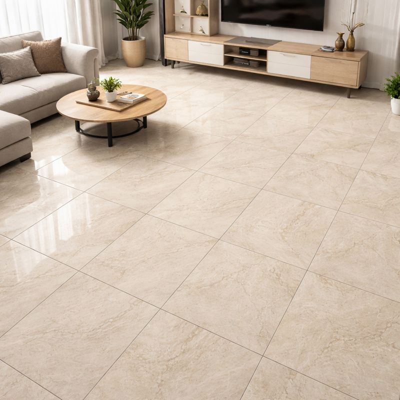 The neutral and modern appearance of the tile complements a wide range of interior styles, from contemporary to traditional. It pairs well with different furniture, colors, and finishes. This versatility makes it suitable for various interior flooring applications, including living rooms, kitchens, and offices.