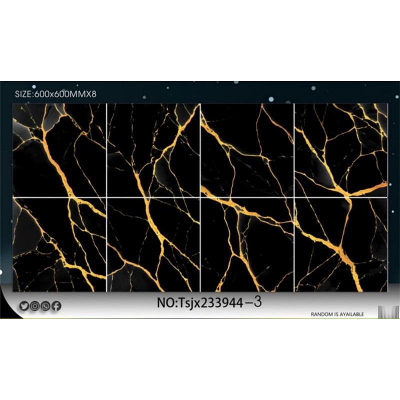 The surface pattern presents elegant gold-toned veining with a clear marble-inspired structure. The visual texture appears refined and well balanced across each piece. This design supports a premium and coordinated floor appearance.