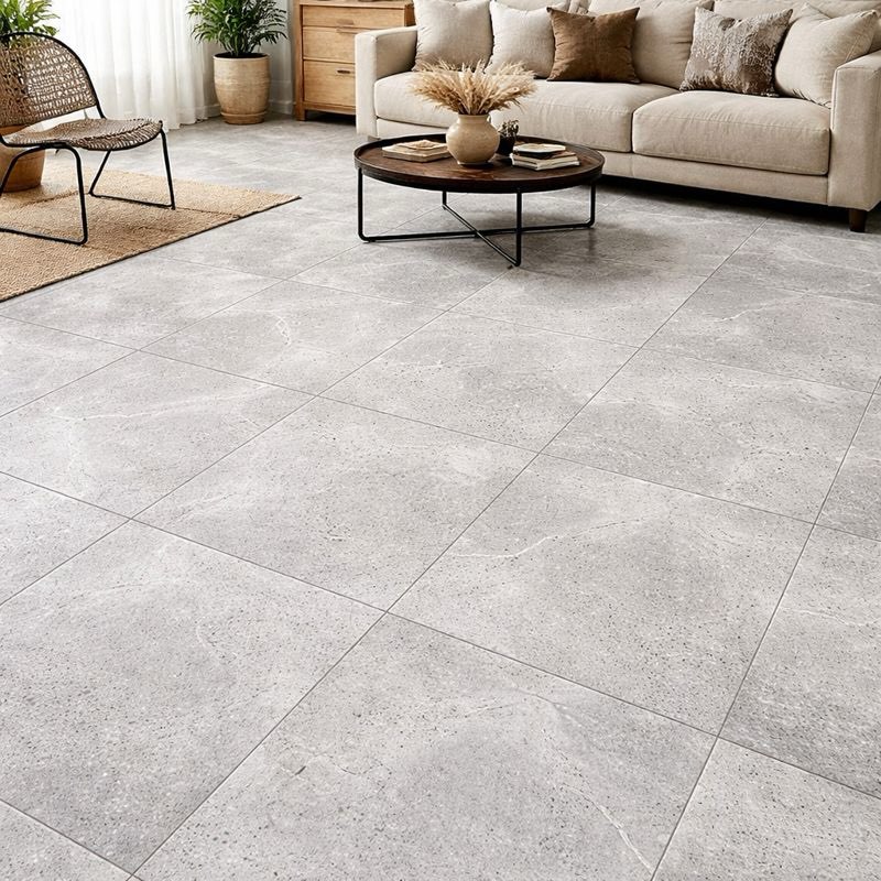 Manufactured with standard ceramic tile processes, the tile offers stable density and uniform body composition. This structure supports consistent thickness and flatness during floor installation. It helps achieve a neat and orderly finished surface across larger interior areas.