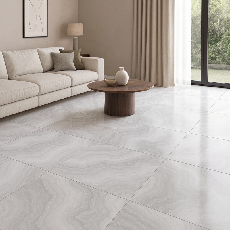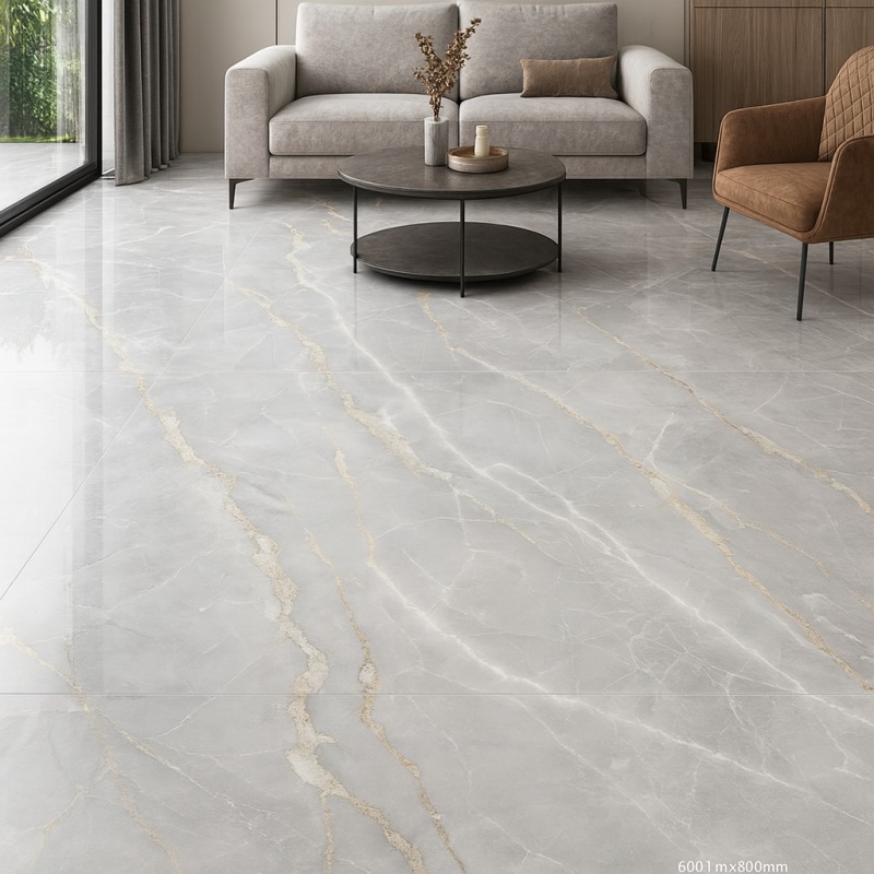 These tiles offer a light-grey tone with marble veining that enhances modern interior themes. The glossy finish highlights the pattern, giving every room a brighter and more refined atmosphere. Their balanced color profile makes them suitable for both residential and commercial projects.