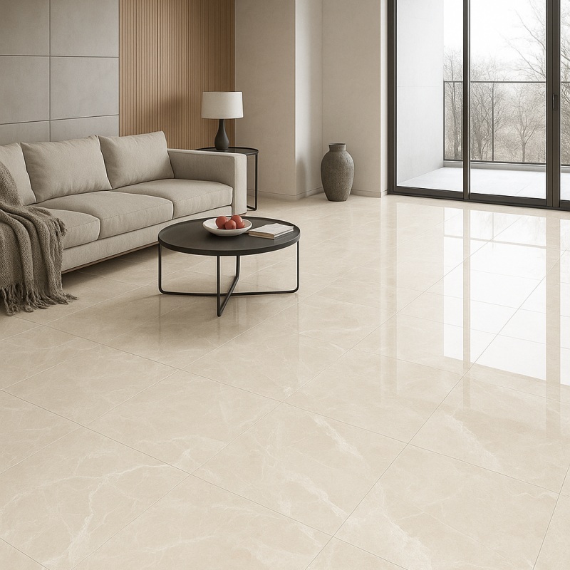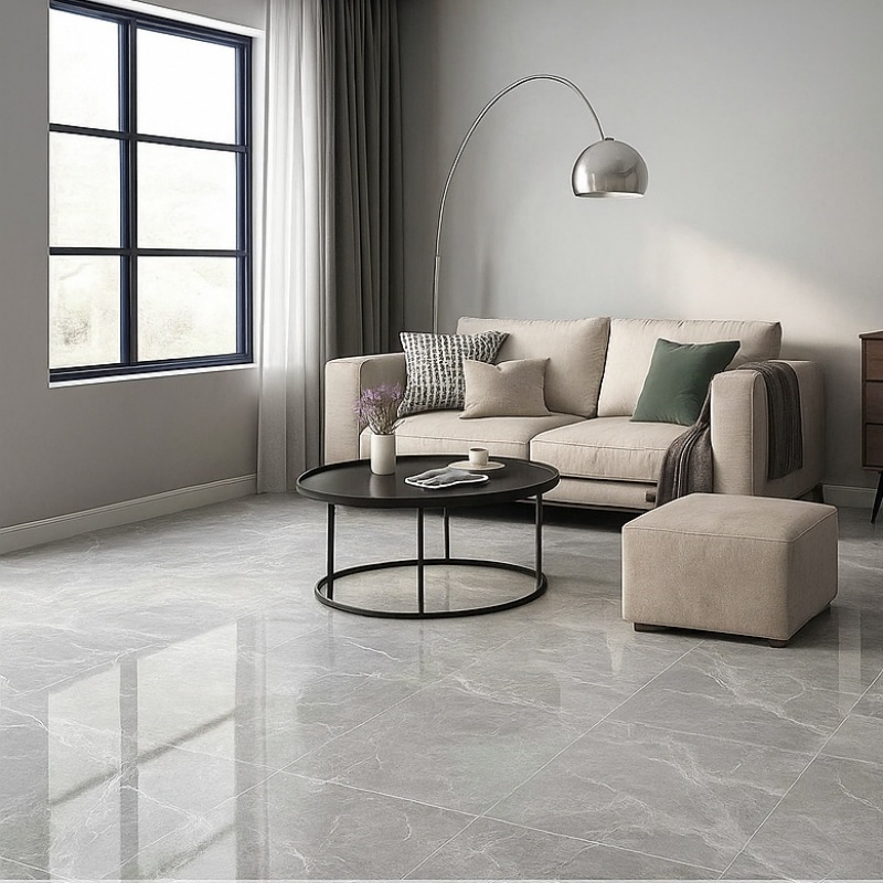 The tile features a refined marble-inspired design that brings a touch of sophistication to any interior. Its polished surface enhances light reflection, creating a luxurious and bright atmosphere. This makes it ideal for homes, hotels, and modern commercial spaces.