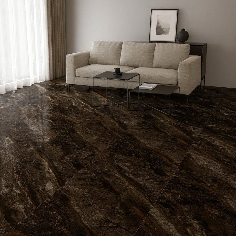 Its balanced tone fits living rooms, bedrooms, hallways, and similar floor applications. The glossy look pairs well with wood furniture, metal accents, and neutral décor. Designers can use it flexibly across both home and light commercial environments.